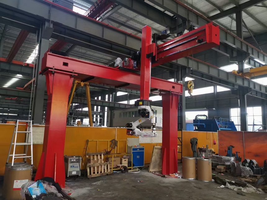 在鋼結構的焊接加工時,工件在寬度和長度上又有了比較高的要求。所以我們會給焊接機器人配套龍門桁架、機器人懸臂,將焊接機器人倒掛在輔助設備上,實現在寬度和長度兩個方向任意位置的焊接加工。這就是焊接機器人輔助設備龍門桁架的作用和意義。